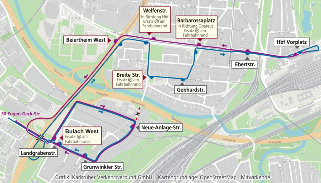 Aufgrund von Bauarbeiten auf der Litzenhardstraße kommt es von März – April zu einer Straßensperrung, welche auch die Umleitung der Buslinien 50/51 erforderlich macht. Die Bushaltestelle Neue-Anlage-Straße in der Litzenhardstraße wird barrierefrei ausgebaut und es werden Leitungsarbeiten durch die Stadtwerke/Tiefbauamt stattfinden. Daher wird die Straße in diesem Bereich und damit auch die Verbindung durch das Bulacher Loch vom 02.03. bis zum 19.04.2026 für den Kfz-Verkehr gesperrt. Fußgänger und Radfahrende können weiter passieren. Die Buslinien 50/51 wird über die Eberststraße und die L605 umgeleitet. Dadurch entfallen leider in Fahrtrichtung Bulach die Haltestellen Breite Straße und Gebhardstraße. Fahrgäste Richtung Bulach werden in dieser Zeit auf die Ersatzhaltestellen Barbarossaplatz und Welfenstraße auf der Nordseite der Ebertstraße verwiesen (siehe Umleitungsplan).