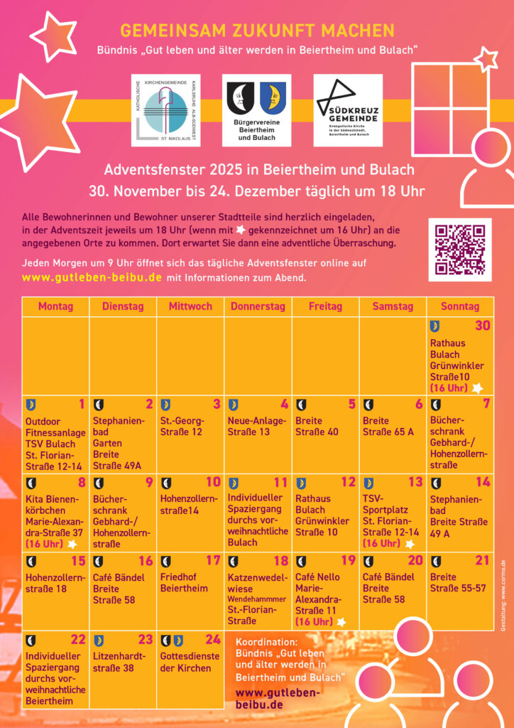 Es ist geschafft: Die neue Homepage „Gut leben und älter werden in Beiertheim und Bulach“ ist seit wenigen Tagen online. Auf den Seiten finden Sie alle Informationen rund um die gemeinsame Initiative der Bürgervereine Beiertheim und Bulach und der beiden Kirchengemeinden sowie vieler engagierter Bulacher- und Beiertheimerinnen.